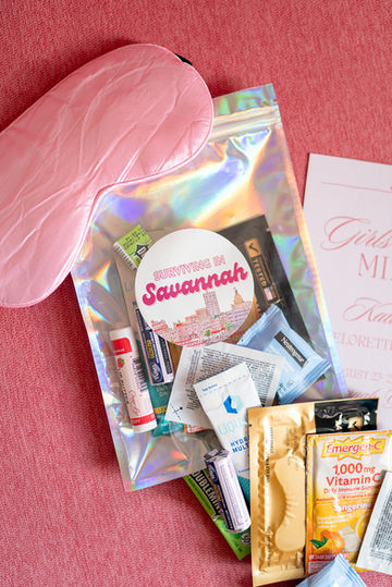 -10 hangover kits ( Advil, Hangover cure, emergen-c, tums, face wipe, gold eye mask and a bandaid all in an adorable hangover bag)